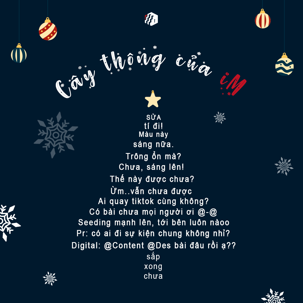 Cây thông của iM không thắp sáng bằng đèn LED, mà rực rỡ bởi những “deadline” và lời réo gọi “bài đâu rồi” rất đỗi thân thương. Chẳng cần xa hoa, bản sắc của chúng mình chính là sự kết nối từ những công cụ quen thuộc và cái tâm đặt vào từng sản phẩm.