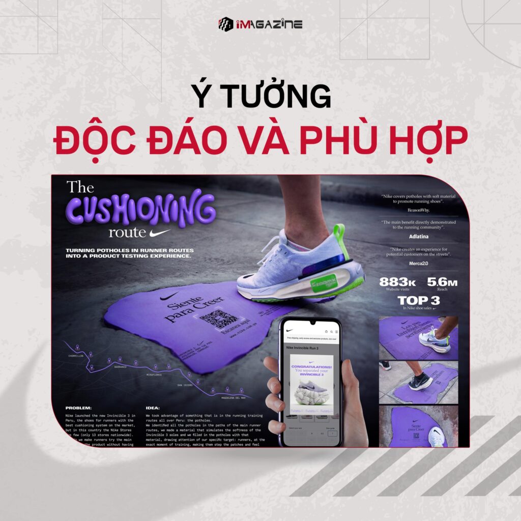 Trước thực trạng đáng lo ngại này, Nike đã nhanh chóng phối hợp cùng Boost triển khai một chiến dịch quảng cáo ngoài trời (OOH) mang tên “The Cushioning Route”. Không chỉ dừng lại ở mục tiêu truyền thông, chiến dịch còn hướng đến việc giải quyết trực tiếp vấn đề thực tế bằng cách cải thiện bề mặt đường tại các khu vực trọng điểm. Thông qua ý tưởng sáng tạo và giàu tính ứng dụng, Nike mong muốn mang lại trải nghiệm chạy bộ an toàn, êm ái hơn, đồng thời thể hiện sự quan tâm đến sức khỏe và đời sống vận động của cộng đồng địa phương.