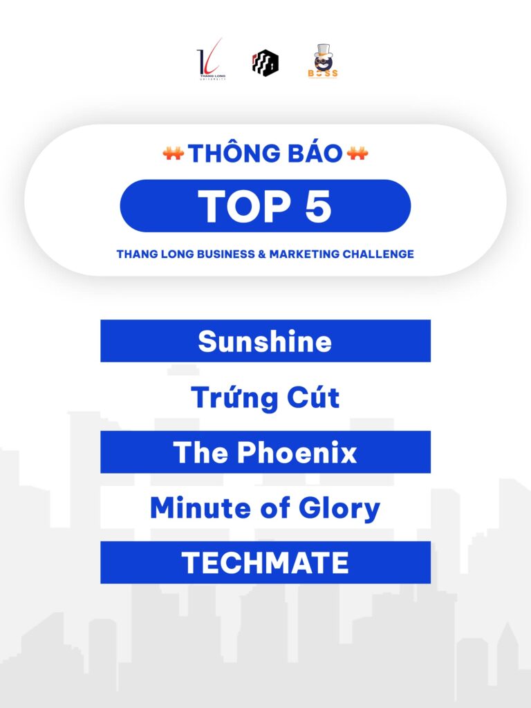 BTC Cuộc thi Thang Long Business & Marketing Challenge 2022 xin chúc mừng các đội thi ấn tượng nhất và xuất sắc nhất đã vượt qua để có mặt trong top 5. BTC sẽ sớm gửi mail xác nhận kết quả top 5 cho các đội thi, các bạn hãy kiểm tra kĩ để không bỏ sót những thông tin quan trọng nhé.